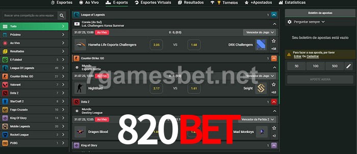 O 820Bet oferece uma grande seleção de opções de apostas em e-sports com probabilidades competitivas